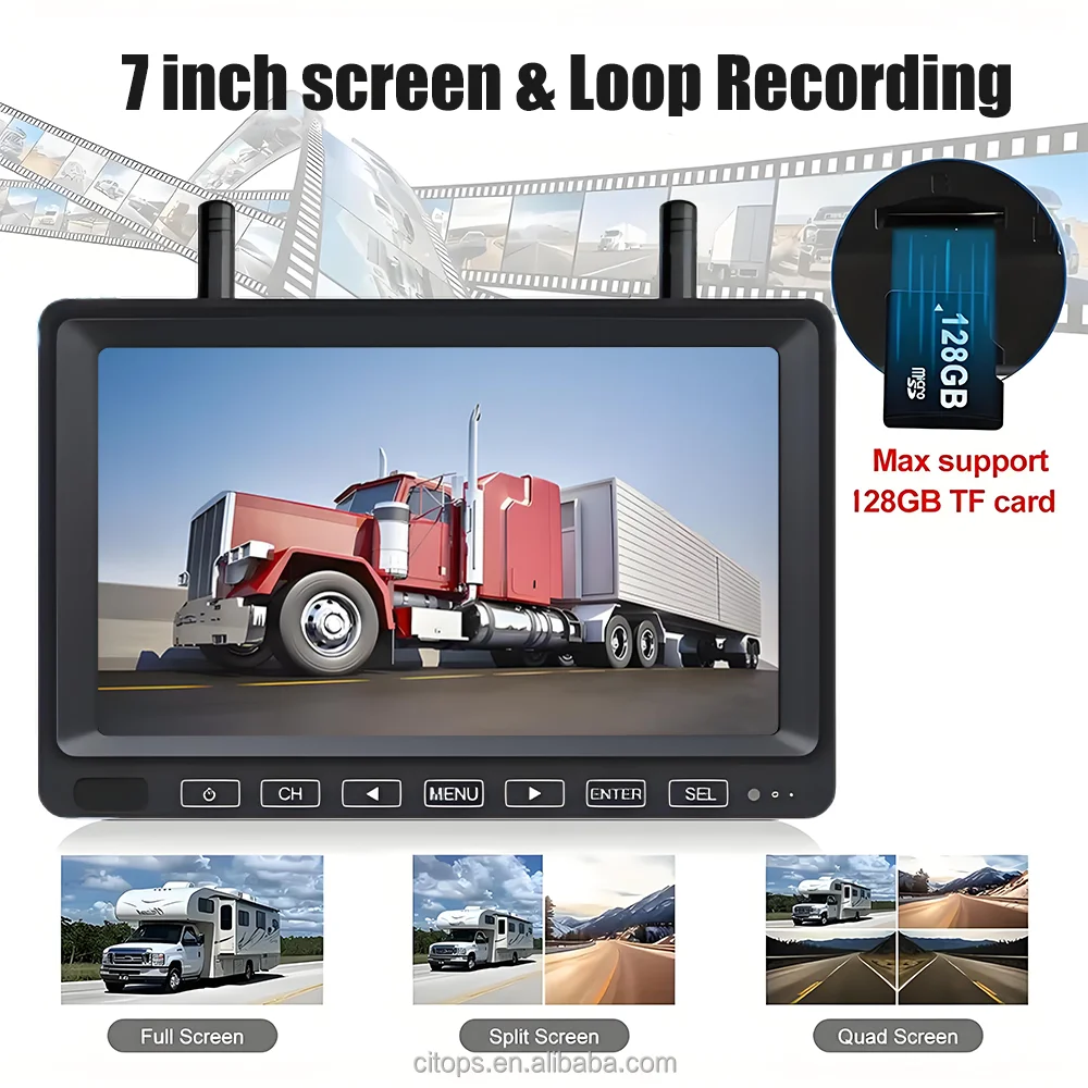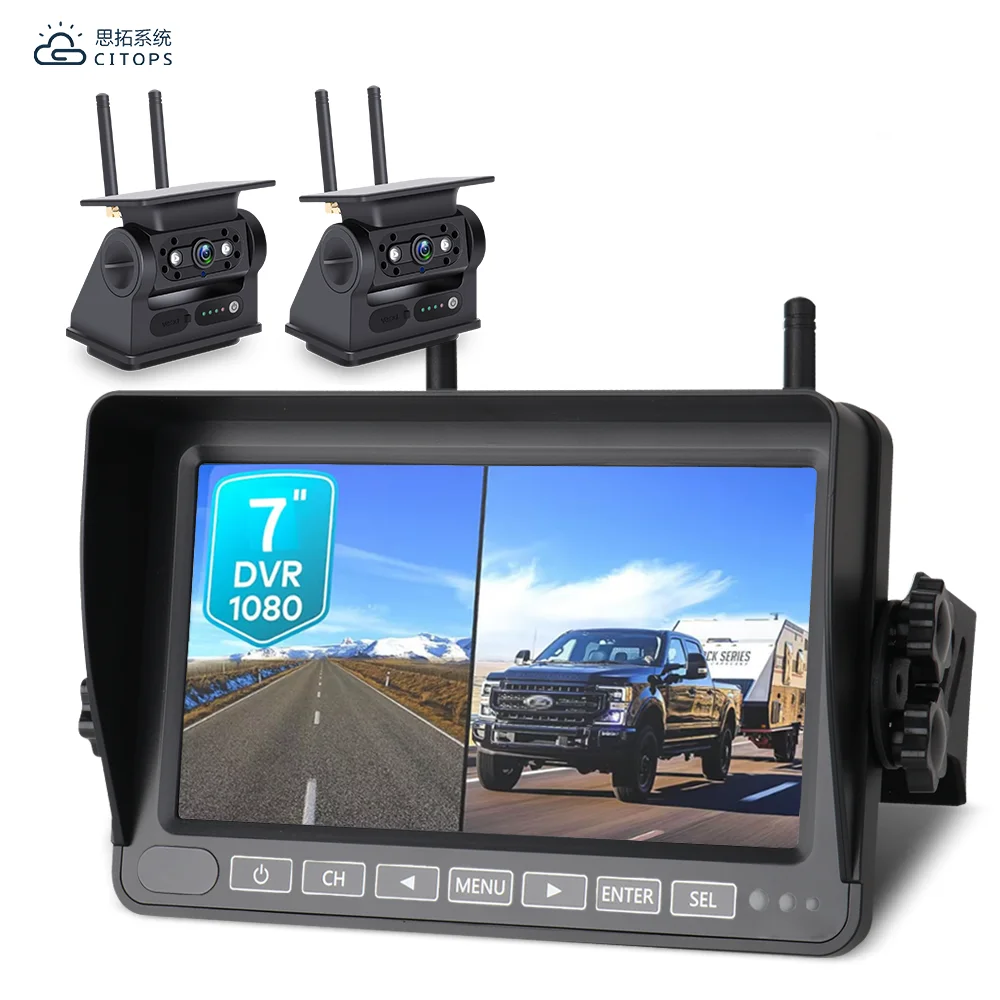 دوربین بیسیم پشتیبان 1080P با محافظت IP66 ضد آب، مانیتور دو صفحهای 7 اینچی همراه با خطوط پارکینگ و ضبط روی کارت SD برای کامیون و RV