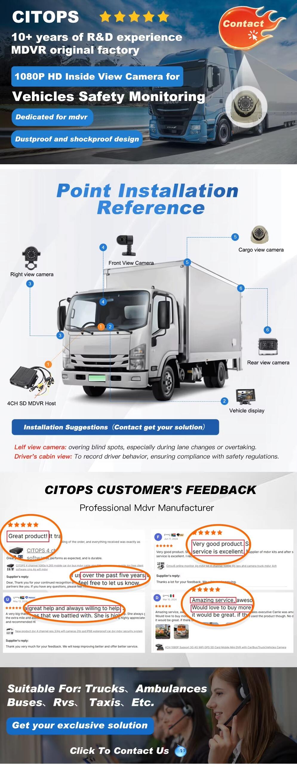 این دوربین نسبتاً کوچک گنبدی داخل خودرو برای نظارت واضح و قابل اعتماد درون خودرو طراحی شده است برای اتوبوسها، کامیونها، ونها و تاکسیها . با رزولوشن 1080P، دید در شب و بدنه ضد برخورد، این دوربین ایمنی مسافران را افزایش میدهد، از رفتارهای نامناسب جلوگیری میکند و پاسخگویی راننده را بهبود میبخشد — همه اینها در حالی که کمتر از 3 وات برق مصرف میکند.